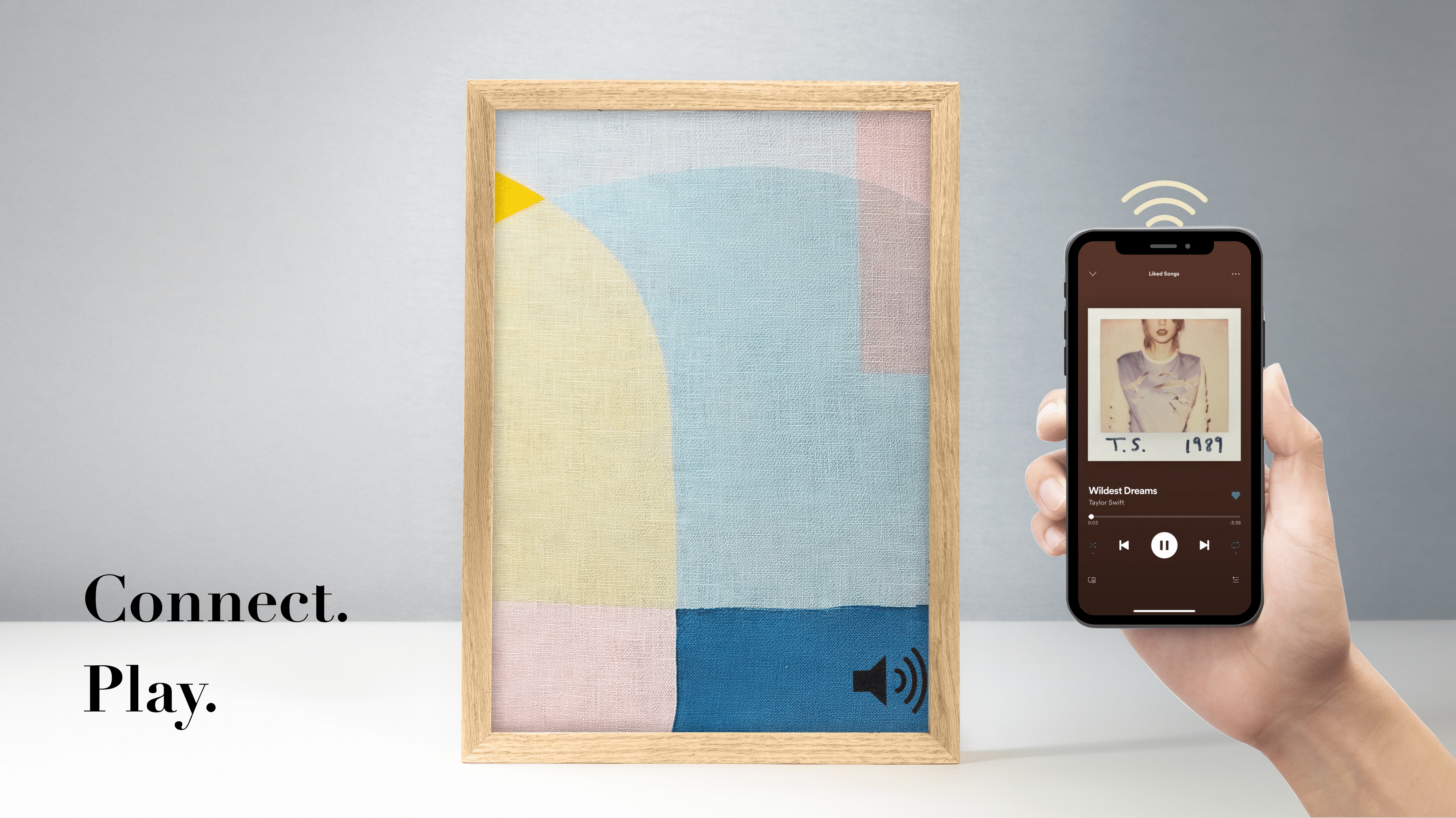 Stands like a frame or hangs like art. Just 500g with Bluetooth, and rich, room-filling sound.