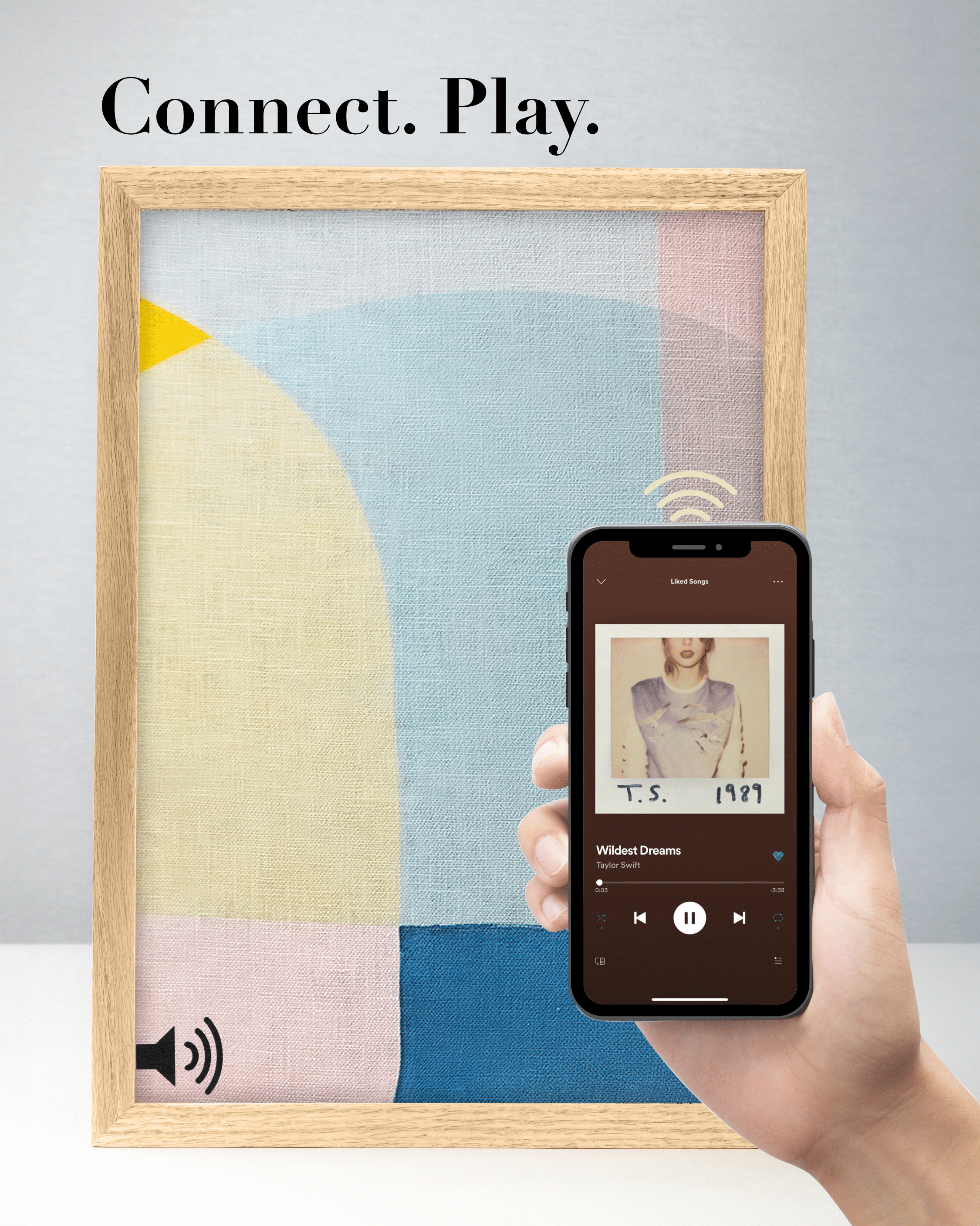 It fools your guests every time. Looks like framed art. Then they hear it — and ask “Where’s the speaker?”